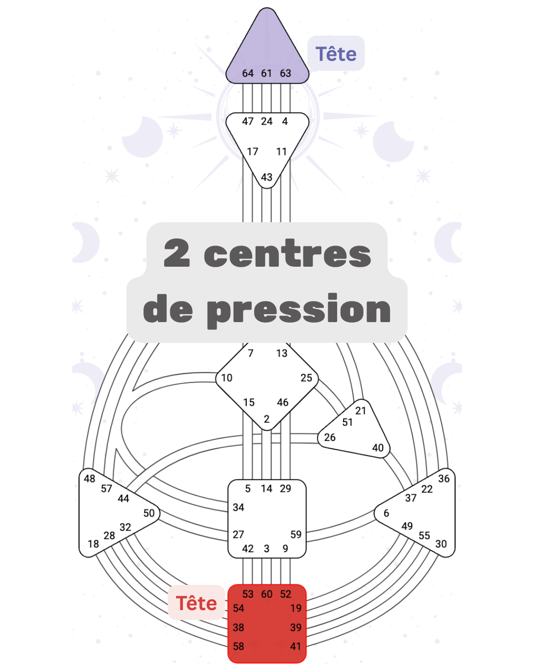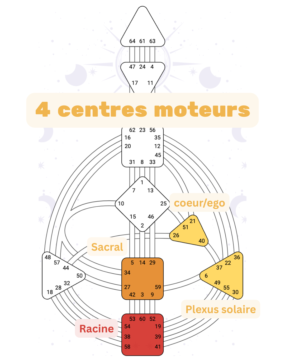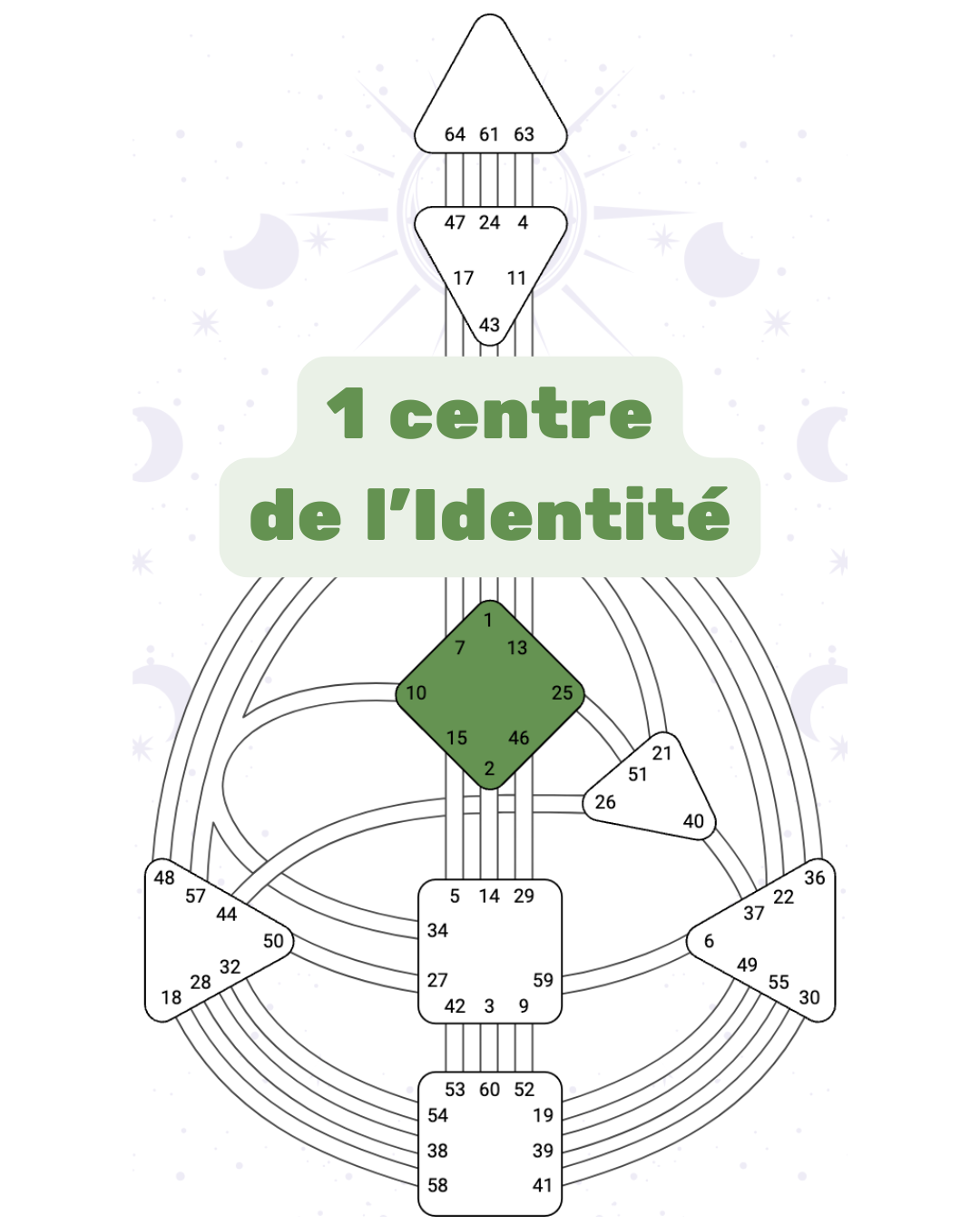 Les Portes : Chaque centre possède plusieurs "portes" (les numéros de 1 à 64). Une porte activée (entourée en couleur) est une qualité, un potentiel énergétique spécifique que vous portez en vous. Elle teinte la saveur de votre énergie.