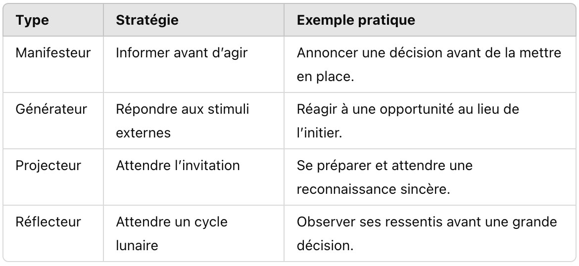 Le Manifesteur, c’est l’initiateur par excellence. Ton aura est fermée et dense, ce qui peut créer une forme de résistance chez les autres si tu agis sans les prévenir. Ta stratégie est donc simple, mais puissante : informer avant d’agir. Pourquoi ? Parce que cela évite les malentendus et les blocages.